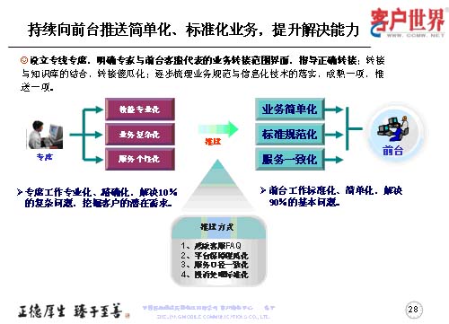 設(shè)立專線專席,并不是指專線越專越多,而是持續(xù)地向前臺(tái)推送簡單化、標(biāo)準(zhǔn)化的業(yè)務(wù),提升前臺(tái)一線的解決能力,所以我們重點(diǎn)以專線的技能專業(yè)化、業(yè)務(wù)復(fù)雜化、服務(wù)個(gè)性化,然后把簡單的形成規(guī)范標(biāo)準(zhǔn)的業(yè)務(wù)向前臺(tái)推送,保障專席的工作是專業(yè)化、精確化地解決10%的復(fù)雜問題,從而更多地去挖掘客戶的需求。而前臺(tái)客服的工作是用標(biāo)準(zhǔn)化、簡單化地解決90%的基本問題。