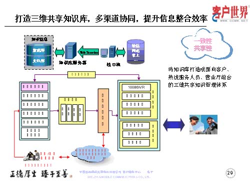 打造三維共享知識(shí)庫,多渠道協(xié)同,提升信息整合效率。我們的知識(shí)庫服務(wù)器是基于客戶系統(tǒng)的大平臺(tái),形成熱線服務(wù)人員、營業(yè)廳人員,乃至客服經(jīng)理的三維共享知識(shí)庫共享,以保障了服務(wù)的一致性,服務(wù)渠道的共享性。