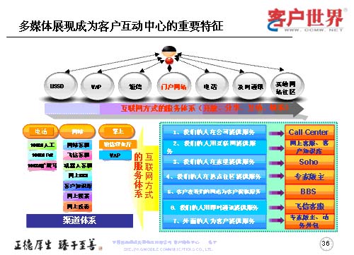 世界上卓越的企業(yè)無所不在,在客戶戰(zhàn)略上最具創(chuàng)新能力的企業(yè),奠定起的競爭,也會(huì)越來越出體現(xiàn)在客戶關(guān)系管理上,隨著數(shù)據(jù)業(yè)務(wù)成為運(yùn)營商的主流業(yè)務(wù),呼叫中心在服務(wù)、營銷、渠道管理等方面的戰(zhàn)略地位會(huì)日益重要,隨著客戶接觸的不斷增長,呼叫中心將逐漸演變成客戶接觸中心、互動(dòng)中心,乃至包括實(shí)體渠道之外的各種電子渠道,任重而道遠(yuǎn)。
