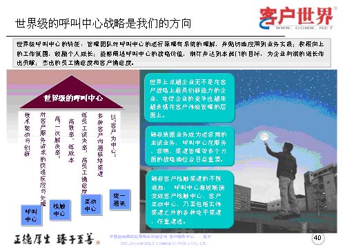 最后我想世界級(jí)的呼叫中心戰(zhàn)略是我們從事客戶服務(wù)行業(yè),從事呼叫中心人的方向,從我們理解的世界級(jí)呼叫中心特征來講,管理團(tuán)隊(duì)?wèi)?yīng)對(duì)呼叫中心的運(yùn)營原理有系統(tǒng)的理解,并貼切地應(yīng)用到業(yè)務(wù)實(shí)踐,創(chuàng)造積極向上的工作氛圍,鼓勵(lì)員工成長,能夠闡述呼叫中心的戰(zhàn)略價(jià)值,制訂并達(dá)到本部門的目標(biāo),為企業(yè)利潤的增長作出杰出的貢獻(xiàn),杰出的員工滿意度和客戶滿意度。所以世界級(jí)呼叫中心我們理解是從七個(gè)方面來衡量,以“客戶為中心”,多種客戶溝通的聯(lián)絡(luò)渠道,低員工流失率和高客戶滿意度,高效率、低成本,高“一次性解決率”,對(duì)客戶服務(wù)請(qǐng)求的快速反應(yīng)與處理,技術(shù)驅(qū)動(dòng)與創(chuàng)新。
