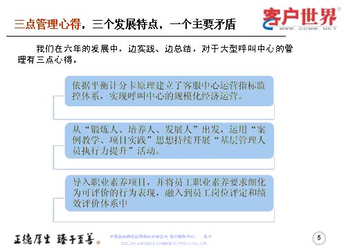 在這六年中,我們有三點(diǎn)管理心得,三個(gè)發(fā)展特點(diǎn),一個(gè)主要矛盾。我們邊實(shí)踐邊總結(jié),對(duì)大型呼叫中心運(yùn)營的管理有三點(diǎn)心得: