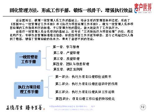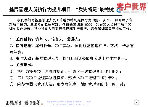 大家知道基層管理人員其實(shí)是兵頭將尾的最關(guān)鍵,我們將對(duì)基層管理人員的工作能力,特別是執(zhí)行力的提升是從05年8月份就開始了專項(xiàng)研究,三年多的具體實(shí)踐,值班長的培訓(xùn)率達(dá)到100%,超過50人經(jīng)過了項(xiàng)目經(jīng)理的角色鍛煉,目前很多擔(dān)任過項(xiàng)目經(jīng)理的已經(jīng)承擔(dān)了生產(chǎn)調(diào)度、話務(wù)管理等重要的管理崗位。在這個(gè)項(xiàng)目當(dāng)中,我們從四個(gè)方面入手,工作目標(biāo)是鍛煉人、培養(yǎng)人、發(fā)展人。指導(dǎo)思想是案例教育、項(xiàng)目實(shí)踐,固化規(guī)范管理標(biāo)準(zhǔn)、方法,傳承管理經(jīng)驗(yàn)。參與人員就是基層管理人員,話務(wù)值班長以上的生產(chǎn)骨干。我們主要運(yùn)用的形式是執(zhí)行力提升項(xiàng)目系統(tǒng)培訓(xùn),形成了《一線管理者工作手冊(cè)》。三月制項(xiàng)目經(jīng)理的實(shí)踐操練,通過競聘的方式產(chǎn)生,形成了《項(xiàng)目經(jīng)理工作手冊(cè)》。階段性的固化-優(yōu)化-再固化的管理方法,形成案例庫,做好管理者的傳幫帶。