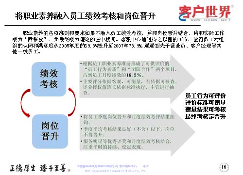 職業(yè)素養(yǎng)不是說在嘴上,講在課上,而是更多地融入到員工的績效考核于崗位晉升當(dāng)中。以解決工作素養(yǎng)要求和實(shí)際工作的兩張皮,以及使得客服理念成為理論的空中樓閣。所以我們是持之以恒地開展一線員工組織認(rèn)同滿意度調(diào)查,我們每年都會(huì)做一線客服人員的滿意度調(diào)查,在滿意度調(diào)查當(dāng)中,從05年的69.3%,提升到07年的73.9%,而且遙遙領(lǐng)先于營業(yè)員和客服經(jīng)理。而在績效考核中主要把員工行為素質(zhì)、團(tuán)隊(duì)合作占到了員工月度績效的16.5%,使大家認(rèn)識(shí)到作為一個(gè)組織中的一員,作為團(tuán)隊(duì)我們是為了一個(gè)共同的目標(biāo),彼此依賴、彼此信任,同時(shí)也要強(qiáng)化績效來管理。所以主要的評(píng)分依據(jù)是客觀、可衡量、有依據(jù)可查,同時(shí)也把這些也作為客服人員季度晉升和月度績效考評(píng)掛鉤,如果該員工季度的平均考核在良好以下的話,將得不到晉升,最終實(shí)現(xiàn)的是員工行為可評(píng)價(jià),評(píng)價(jià)標(biāo)準(zhǔn)可衡量,衡量結(jié)果可考核,最終考核定晉升。