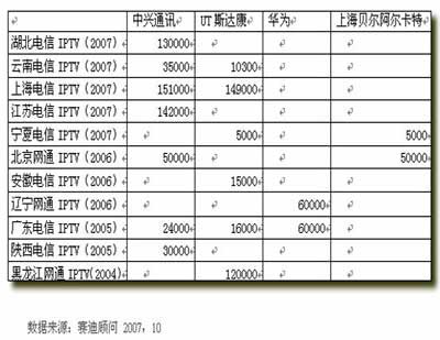 在IPTV設(shè)備供應(yīng)商中,各家廠商各有千秋,其中在國內(nèi)市場占有率最好的是中興通訊,其次是UT斯達(dá)康、華為、上海貝爾阿爾卡特。中興通訊跟華為均能提供端到端的解決方案,從頭端到客戶端,從業(yè)務(wù)層到傳輸層,提供完整的設(shè)備,可以使用統(tǒng)一的平臺(tái)對整個(gè)系統(tǒng)進(jìn)行管理,并且在保證統(tǒng)一的同還提供了較好的開放性,支持多家內(nèi)容提供商及STB的接入。