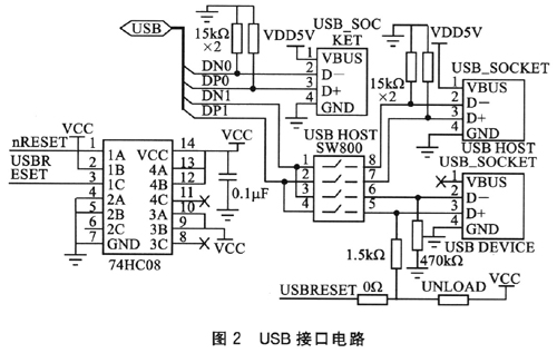 在ARM9開發(fā)板內(nèi)部含有1個USB2.O接口控制器,接口電路如圖2所示。共有3個LISB接口(2個Host和1個Device),通過選擇開關(guān)SW800進行選通控制。74HC08作為4個二輸入與門邏輯電路,負(fù)責(zé)控制信號的邏輯組合。該接口用來連接USB接口的外部設(shè)備。