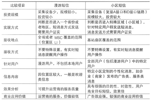 兩個系統(tǒng)最大的不同點(diǎn)是接收短信的范圍和用戶不一樣,漫游短信是針對漫游用戶在一個相對較大區(qū)域內(nèi),因此只適合運(yùn)營商發(fā)一般性的問候短信,提高運(yùn)營商的服務(wù)質(zhì)量;小區(qū)短信則是在一個較小的區(qū)域內(nèi)(特定地點(diǎn)),針對特定用戶(可能包括漫游用戶),在一個特定的時間,發(fā)送特定的消息,因此這種消息具有較強(qiáng)的針對性,具有較高的商業(yè)用戶價值,可用于企業(yè)(商家)發(fā)布廣告和服務(wù)類的信息,能夠成為一種典型的增值服務(wù)。