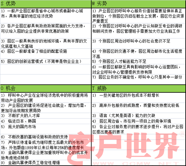 筆者在此更愿意用SWOT分析的模式來闡述中國呼叫中心產(chǎn)業(yè)園區(qū)的特點(diǎn):