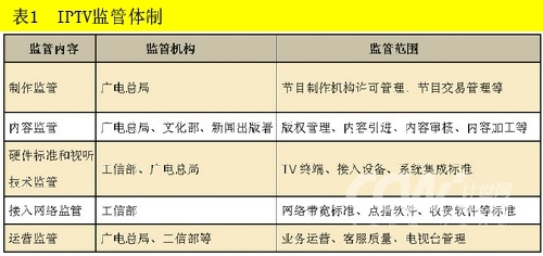 根據(jù)國務(wù)院直屬部委機構(gòu)的職能劃分,國家將信息產(chǎn)業(yè)、廣播電影電視產(chǎn)業(yè)分別交給工信部和國家廣電總局管理。由表1可以看出,在IPTV的監(jiān)管方面,國家廣電總局起著舉足輕重的作用,尤其是關(guān)于節(jié)目制作和運營方面的監(jiān)管,對IPTV的發(fā)展影響重大,隨時都有可能出臺新的規(guī)定,影響整個IPTV的發(fā)展。