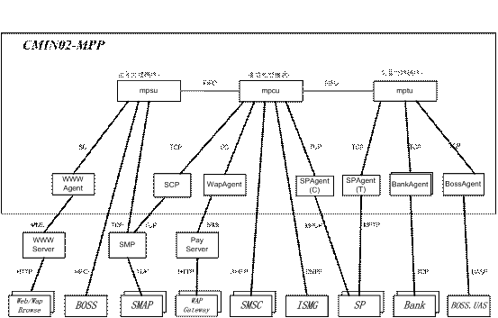 Provider)的交易請求,根據(jù)用戶的賬戶設置情況,與本地數(shù)據(jù)庫(或銀行、或BOSS系統(tǒng))交互,完成對用戶支付賬戶的扣費操作;業(yè)務受理部分MPSU:完成業(yè)務受理的功能,處理管理員、營業(yè)廳操作員、或用戶的業(yè)務管理請求,進行相應查詢、配置或計算,并返回結果;代理部分Agent,例如:WWWAgent,BankAgent等負責與各個外部實體的通信;另外,系統(tǒng)還應有輔助模塊用來完成系統(tǒng)各進程的守護、監(jiān)視、控制、以及系統(tǒng)性能數(shù)據(jù)的采集功能。