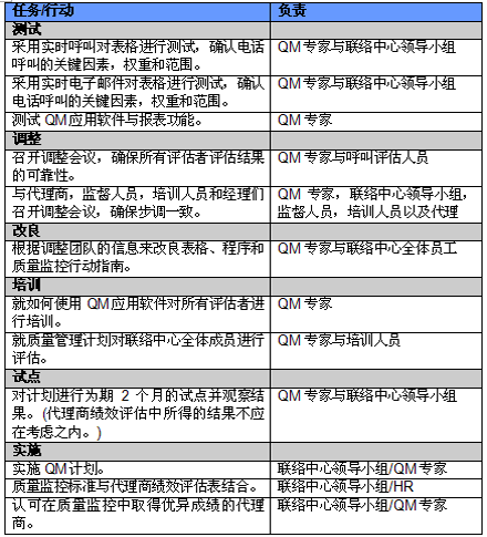 4. 開展項(xiàng)目交流。管理人員必須就新的或者修繕后的QM計(jì)劃與代理商進(jìn)行交流。QM的成功與否與代理商的合作密不可分,如果代理商受邀參與新QM計(jì)劃的開發(fā)并且所有改變都在雙方之間明確交流過,那么成功的機(jī)會(huì)也將大大提高。交流的內(nèi)容應(yīng)包括為什么要開發(fā)這樣一個(gè)計(jì)劃,它的作用和職責(zé)是什么,它對(duì)代理商會(huì)產(chǎn)生哪些影響(對(duì)于他們的評(píng)估和提升)以及它能帶來哪些好處。幫助代理商認(rèn)識(shí)到QM計(jì)劃積極的一面很重要,因?yàn)橹挥羞@樣才能讓他們看到QM不僅僅是管理人員用來告訴他們做錯(cuò)了事情的一種手段。讓聯(lián)絡(luò)中心全體員工參與QM計(jì)劃的開發(fā)能夠建立他們對(duì)該計(jì)劃的支持,提高接受度的同時(shí)避免不知所措。這對(duì)聯(lián)絡(luò)中心剛剛嶄露頭角,QM計(jì)劃還未全面鋪開的中國(guó)市場(chǎng)而言尤為重要。