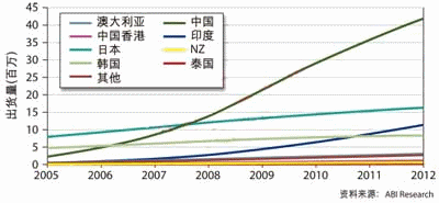 圖1:根據(jù)國家和地區(qū)細分的2005年到2012年亞太區(qū)家庭網(wǎng)絡發(fā)展趨勢