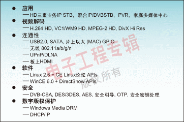 H.264、WM9、AVS的STB810平臺和用于HD H.264 a和VC1的STB225平臺。IP-STB平臺應(yīng)該提供一個(gè)驗(yàn)證核技術(shù),例如NXP公司基于Nexperia技術(shù)的平臺,并且每一個(gè)研發(fā)工具都向后兼容。