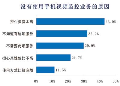 諾達咨詢對沒有使用手機視頻監(jiān)控的用戶原因進行調(diào)查,結(jié)果表明,43%的用戶擔心資費太高,其次對手機監(jiān)控不了解和不需要此項服務的用戶各占32%、30%。22%的用戶擔心性價比不高,12%用戶因為使用比較麻煩而不選擇手機視頻監(jiān)控服務。