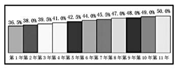 除了分檔包月的語(yǔ)音套餐,KDDI還根據(jù)消費(fèi)者的不同需求提供了多樣折扣優(yōu)惠,其中包括在網(wǎng)時(shí)長(zhǎng)優(yōu)惠、家庭優(yōu)惠、個(gè)人優(yōu)惠、學(xué)生優(yōu)惠等多種方式(圖1)。多樣優(yōu)惠折扣方式之間也可以通過組合產(chǎn)生新的優(yōu)惠折扣內(nèi)容。例如:在網(wǎng)時(shí)長(zhǎng)優(yōu)惠與家庭優(yōu)惠共享的套餐在入網(wǎng)的第1年優(yōu)惠折扣達(dá)到40%,此后每續(xù)約1年將增加1%的折扣優(yōu)惠,逐年累積下來,在第11年將享受高達(dá)50%的優(yōu)惠折扣(圖2)。時(shí)段優(yōu)惠套餐中體現(xiàn)分時(shí)段優(yōu)惠,區(qū)分忙時(shí)、閑時(shí),周末時(shí)間和工作時(shí)間,分別定價(jià)。例如,同樣是9500日元的套餐檔次,在時(shí)段優(yōu)惠套餐中,周末白天(閑時(shí))的資費(fèi)是每分鐘10日元,而在非時(shí)段優(yōu)惠的普通套餐中,每分鐘的資費(fèi)是24日元,可見在網(wǎng)絡(luò)閑時(shí)可以享受更多的資費(fèi)優(yōu)惠。而針對(duì)學(xué)生和老人設(shè)計(jì)的套餐也能享受比普通套餐更優(yōu)惠的資費(fèi),這就體現(xiàn)了區(qū)別細(xì)分市場(chǎng)的差異化定價(jià)。