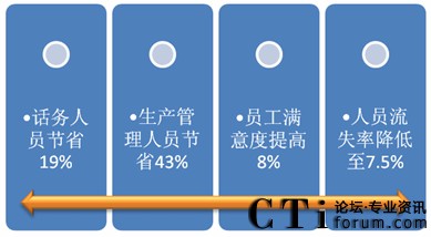 專席將復(fù)雜的、疑難的業(yè)務(wù)承擔(dān)起來,前臺員工平均通話時長由專席設(shè)置前的82秒壓縮到目前的67秒。由于通話時長的縮短,節(jié)省了大量人力資源,江蘇移動10086客服中心全年減少226名客戶代表人工成本和156個臺席成本,年節(jié)省人工成本591萬元和臺席投資費用611萬。