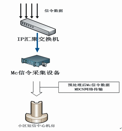 在軟交換模式下,在不影響信令傳輸?shù)那疤嵯拢^(qū)短信系統(tǒng)通過對Mc接口(MGW與MSCServer之間)進(jìn)行IP數(shù)據(jù)采集,替代采集A接口七號信令數(shù)據(jù),對采集到的Mc接口數(shù)據(jù)進(jìn)行分析、合成,獲取到小區(qū)短信平臺所需的重要、關(guān)鍵數(shù)據(jù)。