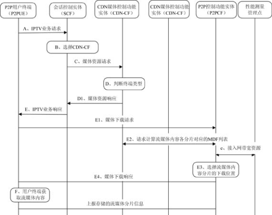 本架構(gòu)的最大特點是結(jié)合CDN和NGN架構(gòu)(注:為了簡化沒有給出詳細的NGN相關控制實體,架構(gòu)中只體現(xiàn)了會話控制實體和資源接納控制功能實體),在此基礎上引入P2P相關功能,包括P2P控制實體和P2P用戶終端。通過對基于NGN的IPTV架構(gòu)和CDN架構(gòu)的改進,使該架構(gòu)既能夠具備電信網(wǎng)中網(wǎng)絡資源可控、可管的特征,又通過引入P2P具備了一定的靈活性和自組織能力,將電信網(wǎng)和互聯(lián)網(wǎng)技術(shù)的優(yōu)勢均集中在了一起。