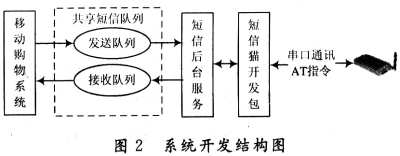 基于開發(fā)周期及成本的考慮,本系統(tǒng)采用開發(fā)包形式。短信貓開發(fā)包是針對目前常用短信模塊開發(fā)的短信應(yīng)用API集合,具有成熟穩(wěn)定、支持多種語言、高可靠性等特點特點。系統(tǒng)開發(fā)結(jié)構(gòu)圖如圖2所示。