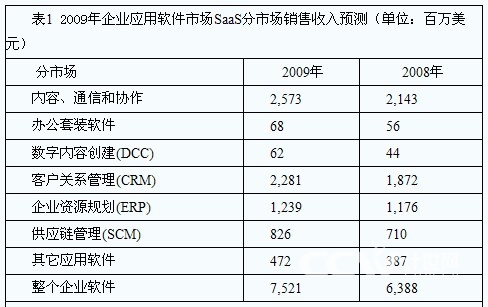 在Gartner的統(tǒng)計中,SaaS領域中,除了CRM之外,內(nèi)容、通訊和協(xié)作市場同樣表現(xiàn)不俗,在2009年,這一市場的銷售收入將從2008年的21.4億美元增長到26億美元,甚至超過了CRM分市場的23億美元。其他如ERP分市場等同樣占據(jù)不小的份額。