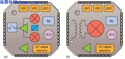 圖1:ADI的ADRF670x是一個帶PLL和VCO的發(fā)送調(diào)制器(a)。ADRF660x混頻下變頻器包括一個用于單端50Ω輸入的射頻輸入不平衡變壓器和一個帶VCO的PLL合成器(b)。這兩個器件都適用于LTE和WiMAX基站設(shè)計。
