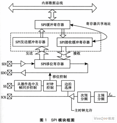 dsPIC30F6014提供了2個(gè)SPI接口模塊,每個(gè)接口模塊包括三個(gè)特殊功能寄存器和四個(gè)引腳。SPIxBUF是數(shù)據(jù)緩沖寄存器。需要注意的是,接收緩沖SPIxRBF和發(fā)送緩沖SPIxTBF共享同一個(gè)地址,即它們都是地址映射到SPIxBUF的。也就是說,當(dāng)對(duì)接收或發(fā)送緩沖寄存器操作時(shí),都只能對(duì)SPIxBUF進(jìn)行操作,而不能直接對(duì)SPIxRBF或SPIxTBF進(jìn)行操作。SPIxCON是控制寄存器,用來(lái)對(duì)sPI模塊的操作模式等進(jìn)行配置;SPIxSTAT是狀態(tài)寄存器,用來(lái)標(biāo)示SPI模塊所處的狀態(tài)。其模塊框圖如圖1所示。