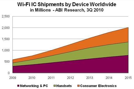 Wi-Fi技術(shù)現(xiàn)已被用于幾乎所有筆記本和上網(wǎng)本、智能電話和游戲設(shè)備。電話、音頻播放器、打印機(jī)、機(jī)頂盒以及其他消費(fèi)類電子設(shè)備對(duì)Wi-Fi技術(shù)的采用率也在不斷增加,來自Wi-Fi聯(lián)盟和多家調(diào)研機(jī)構(gòu)的數(shù)據(jù)印證了這種市場增長趨勢。2009年,僅在中國銷售的具備Wi-Fi功能的筆記本電腦就達(dá)到800萬臺(tái),全球Wi-Fi設(shè)備認(rèn)證數(shù)量則增加了約50%,消費(fèi)類電子設(shè)備和電話數(shù)量增加了100%以上。截止到2010年7月,消費(fèi)類電子設(shè)施與電話類產(chǎn)品的認(rèn)證數(shù)量已經(jīng)超過了2009年全年數(shù)量,預(yù)計(jì)全年售出約8億臺(tái)Wi-Fi設(shè)備。