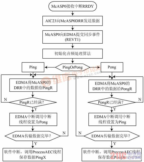 基于DSP 的實(shí)時(shí)處理的實(shí)現(xiàn),本文將AIC23 采集到的數(shù)據(jù)先存儲(chǔ)到SDRAM 中,在需要處理的時(shí)候利用EDMA 實(shí)現(xiàn)Ping Pong 緩沖,將待處理的數(shù)據(jù)分批搬運(yùn)到片內(nèi)存儲(chǔ)器,結(jié)合高速緩存和片內(nèi)內(nèi)存設(shè)計(jì)合適的數(shù)據(jù)結(jié)構(gòu),并將數(shù)據(jù)對(duì)齊,這樣大大減小了數(shù)據(jù)搬移帶來(lái)的開銷。