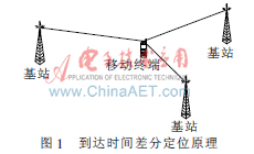 TDOA定位技術(shù)是根據(jù)不同基站接收到的同一移動終端信號在傳輸路徑上的時(shí)延差異實(shí)現(xiàn)終端定位。當(dāng)移動終端發(fā)出緊急呼叫時(shí),移動網(wǎng)絡(luò)通過其附近的三個或更多個不同基站接收并測量出信號的到達(dá)時(shí)間,網(wǎng)絡(luò)計(jì)算出到達(dá)時(shí)間兩兩之間的差值,移動終端必然位于這些時(shí)間差值所對應(yīng)的以兩兩基站為焦點(diǎn)的雙曲線上[2]。這樣,根據(jù)兩條雙曲線的交點(diǎn)就能夠確定手機(jī)的位置。所以只要附近三個基站接收到移動終端發(fā)出的信號就可以達(dá)到定位目的。TDOA技術(shù)只需要移動通信網(wǎng)絡(luò)參與網(wǎng)絡(luò)參數(shù)的測量,不需要對終端硬件上的改動。因此實(shí)現(xiàn)TDOA定位只需要在移動通信網(wǎng)中增加相應(yīng)功能模塊就可以了,并支持所有廠商生產(chǎn)的移動終端。同時(shí)它具有定位精度高、響應(yīng)時(shí)間短、實(shí)現(xiàn)簡單等優(yōu)點(diǎn)。