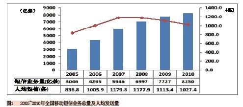 從圖1可以看到,全國(guó)移動(dòng)短信業(yè)務(wù)總量的增速逐年降低,而年人均移動(dòng)短信發(fā)送量則從最高的2007年的1180條下滑到了2010年的1027.4條。