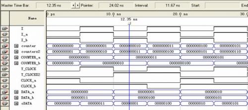 使用的信號包括:數(shù)據(jù)信號data_a,dat_b;讀寫有效信號wren_a,wren_b;地址信號address_a,address_b;時鐘信號clock_a,clock_b;輸出數(shù)據(jù)信號q_a,q_b?梢钥吹剿械男盘柖际浅蓪Τ霈F(xiàn)的,就是為了進(jìn)行乒乓方式的數(shù)據(jù)傳輸。分成了兩個RAM區(qū)域,A和B,相當(dāng)于前面講乒乓方式里的數(shù)據(jù)緩沖模塊1和2。兩個RAM塊是交替著讀寫(由I_a和I_b決定),輸出數(shù)據(jù)流也是由I決定。剛說到寫時鐘是13.5M,讀時鐘是27M,所以clock_a和clock_b必須是讀寫時鐘切換著輸入,而且地址的計數(shù)也不一樣,寫周期時候地址增加的時鐘是13.5M,讀周期地址增加的時鐘是27M。所以每行的數(shù)據(jù)讀了兩遍,相當(dāng)于隔行變逐行。圖6在Qartus II下RAM的乒乓操作功能仿真圖: