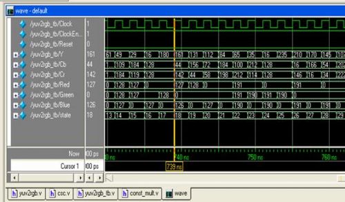 主模塊yuv2rgb實現(xiàn)子模塊的調(diào)用,用Modelsim進(jìn)行了仿真。仿真波形如圖7所示: