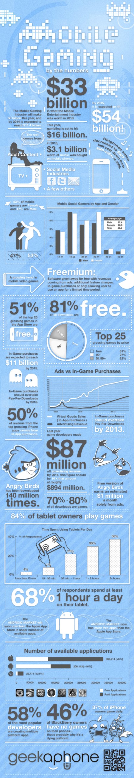 隨著移動互聯(lián)網(wǎng)浪潮的興起,大家玩游戲的平臺逐漸從傳統(tǒng)的游戲機,PC,TV向新興的智能手機和平板電腦等移動終端遷移。PC時代的游戲巨頭EA,育碧等公司的光芒不再,PopCap,Rovio和Zynga等新興游戲公司出品的游戲則吸引著越來越多的玩家。照目前強勁的發(fā)展趨勢來看,移動游戲在未來將取得像PC游戲現(xiàn)在的地位,成為游戲市場的主力。關(guān)注移動終端發(fā)展的博客Geekaphone制作了下面這張超大信息圖,用詳細(xì)的統(tǒng)計數(shù)字展示了移動游戲發(fā)展的強勁趨勢。