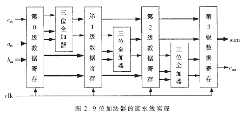 (2)針對(duì)不同運(yùn)算的位寬需要,設(shè)計(jì)專用的加法器和乘法器。本文對(duì)整數(shù)變換中的加法器采用三級(jí)流水線加法器,實(shí)現(xiàn)9位加法,每級(jí)流水線完成三位超前進(jìn)位加法,將邏輯延遲限制在三位加法器之內(nèi)。圖2給出了9位加法器的流水線實(shí)現(xiàn)框圖。選用EPF10K10LC84-3作為適配器件,經(jīng)過Synplify Pro 7.3綜合,結(jié)果表明這種加法器具有較優(yōu)的最高工作頻率和硬件開銷。如表2所示, 常規(guī)加法器的最高工作頻率為37.0MHz,消耗資源卻為28LC,而經(jīng)過優(yōu)化的三級(jí)流水線加法器在消耗資源增加不多的情況下,其最高工作頻率相比常規(guī)加法器提高了257%,達(dá)到94.5MHz。