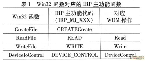 在Windows中,應(yīng)用程序與WDM通信的實(shí)現(xiàn)過(guò)程:應(yīng)用程序應(yīng)先獲得設(shè)備句柄GUID碼,然后利用CreateFile函數(shù)打開(kāi)設(shè)備,通過(guò) DeviceIoControl函數(shù)傳遞控制代碼參數(shù)和WDM進(jìn)行通信,包括從WDM中讀取數(shù)據(jù)和寫數(shù)據(jù)給WDM兩種情況,也可利用ReadFile從 WDM中讀取數(shù)據(jù)或用WriteFile寫數(shù)據(jù)給WDM:當(dāng)下層驅(qū)動(dòng)有觸發(fā)事件時(shí),就需要Event事件通知上層軟件。當(dāng)應(yīng)用程序退出時(shí),CloseHandle則關(guān)閉設(shè)備,這將產(chǎn)生對(duì)應(yīng)于此設(shè)備對(duì)象的相應(yīng)IRP消息。這種關(guān)系如表1所列。
