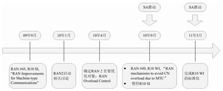 在2010年9月的RAN #49次全會上,在SA的推動下,RAN全會決定成立一個關(guān)于MTC的新的WI,用來解決避免大量MTC設(shè)備接入導(dǎo)致的核心網(wǎng)過載問題。2011年3月份,RAN2完成了此WI并在RAN全會上通過。圖4所示的是3GPP MTC R10標(biāo)準(zhǔn)化項(xiàng)目進(jìn)程情況。