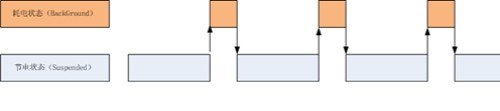 為了節(jié)約電池的電量,智能手機上的操作系統(tǒng)的一個基本策略是,盡量減少正在運行的程序,這個道理很簡單,運行的程序越多,需要耗費的 CPU 計算時間就越多,電量就省不下來。下面的圖是蘋果 iOS 設(shè)備應(yīng)用程序調(diào)度狀態(tài)圖,事實上蘋果設(shè)備是除了用戶正在操作的程序,其他打開的程序進程盡可能都放到“掛起(Suspended)”的狀態(tài)下。在“掛起”的狀態(tài)下面,程序進程處在休眠狀態(tài),不耗費 CPU 計算能力。當用戶沒有對設(shè)備進行操作的時候,整個系統(tǒng)處在休眠的低電狀態(tài)。(這里進程的意思是:程序運行實例)