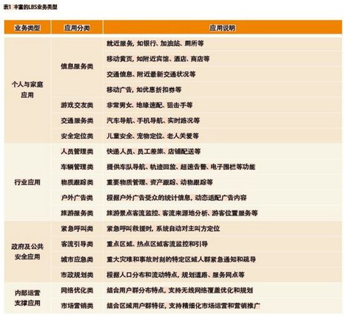 傳統(tǒng)LBS應(yīng)用主要是緊急呼叫、車輛導(dǎo)航、物流管理、人員定位等,其實LBS作為一種基本能力,可以擴展到各類業(yè)務(wù)應(yīng)用中。根據(jù)面向的服務(wù)對象的不同,LBS業(yè)務(wù)可以分為個人與家庭應(yīng)用、行業(yè)應(yīng)用、政府與公共安全應(yīng)用和運營商內(nèi)部運營支撐應(yīng)用四大類型。每種LBS業(yè)務(wù)類型都包括各類豐富應(yīng)用(如表1),這里僅列舉部分應(yīng)用進行簡要探討。