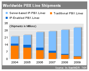 據(jù)In-Stat報(bào)告說,隨著IP線路出貨量今年有望超過傳統(tǒng)PBX,IP PBX進(jìn)入了一個(gè)新的成熟階段。雖然整個(gè)PBX市場預(yù)計(jì)將以6.6%的復(fù)合年增長率增長至2009年,但傳統(tǒng)PBX正在迅速下滑,IP PBX勢頭越來越強(qiáng)。