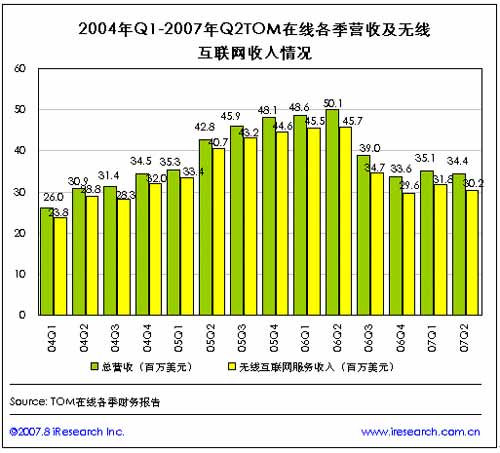 在2006年第二季度總營收以及無線互聯(lián)網服務收入分別達到歷史最高點(分別達到5010萬美元和4571萬美元)之后,TOM在線各季收入及無線互聯(lián)網收入呈逐季下滑趨勢,至2007年第二季度,TOM在線的總營收為3439萬美元,來自無線互聯(lián)網服務的收入為3024萬美元!