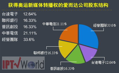 據(jù)IPTVWorld了解,2008年第29屆北京奧運比賽轉播權臺灣區(qū)網(wǎng)絡與手機平臺轉播權。國際奧委會 (IOC)除了證實這項消息,也表示,經(jīng)過度。另外,鑒于愛爾達在美國職棒等運動賽事和韓劇等數(shù)字內容版權經(jīng)營與后制服務擁有豐富的實務經(jīng)驗,中華電在今年4月進一步以溢價參與愛爾達增資,取得21%的股權,成為愛爾達除了經(jīng)營團隊外最大的股東。