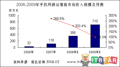 諾達(dá)咨詢報(bào)告《2008手機(jī)網(wǎng)游報(bào)告—產(chǎn)業(yè)發(fā)展與競爭策略》認(rèn)為,手機(jī)網(wǎng)絡(luò)游戲已經(jīng)過了市場導(dǎo)入期,在未來幾年將步入快速發(fā)展階段。咨詢研究數(shù)據(jù)表明,2007年手機(jī)網(wǎng)游市場運(yùn)營收入達(dá)到了1.18億元人民幣,今年將達(dá)3.58億元人民幣,到2009年市場規(guī)模有望突破7.0億元人民幣。