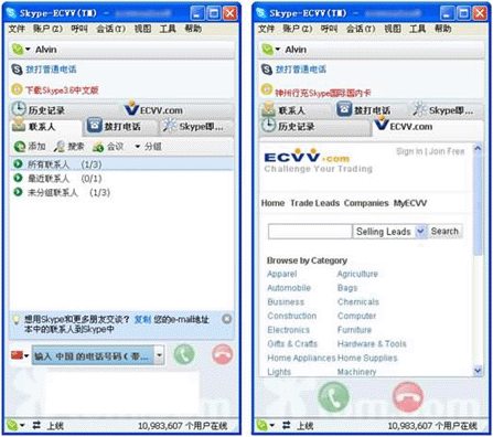 近日,許多貿(mào)易人士在登陸全球貿(mào)易推廣服務(wù)商ECVV的網(wǎng)站時(shí),發(fā)現(xiàn)新增了一項(xiàng)方便貿(mào)易人士在線交流的服務(wù),即“Skype-ECVV貿(mào)易版”。