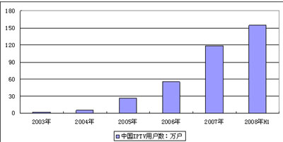 圖 1 2003-2008年上半年中國(guó)IPTV用戶數(shù)