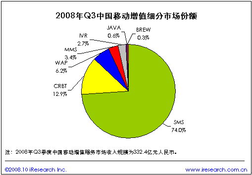 根據(jù)iResearch艾瑞咨詢最新出版的《2008年第三季度中國移動(dòng)增值行業(yè)發(fā)展報(bào)告》數(shù)據(jù)顯示,2008年第三季度中國移動(dòng)增值服務(wù)市場(chǎng)規(guī)模達(dá)332.4億元,同比增長40.2%.其中短信市場(chǎng)規(guī)模以74.0%的比例位居第一,CRBT和WAP分別以12.9%和6.2%的份額居第二、第三。