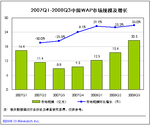 艾瑞咨詢研究發(fā)現(xiàn),2008年第三季度,WAP總體市場(chǎng)規(guī)模為20.5億,環(huán)比增長33.0%.其中,中國移動(dòng)官方WAP市場(chǎng)規(guī)模為18.6億,環(huán)比增長27.1%,中國聯(lián)通官方WAP市場(chǎng)規(guī)模為1.88億,環(huán)比增長24.8%。