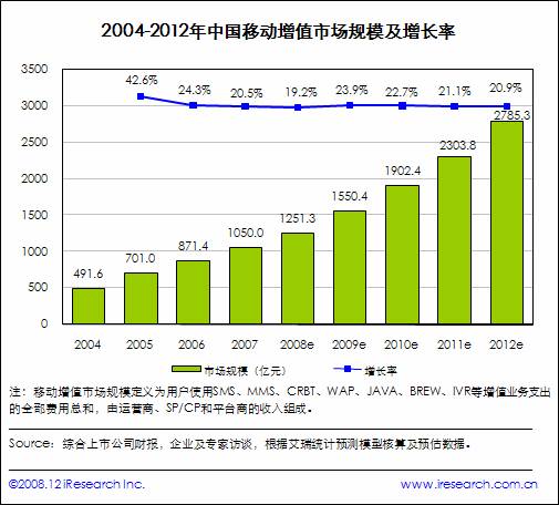 根據(jù)iResearch艾瑞咨詢即將推出的《2008-2009年中國移動(dòng)互聯(lián)網(wǎng)行業(yè)發(fā)展報(bào)告》統(tǒng)計(jì),2008年中國移動(dòng)增值市場規(guī)模達(dá)1251.3億人民幣(約合183.2億美元),相比2007年的1050億人民幣年同比僅增長19.2%,相比2007年增速放緩。(中國移動(dòng)增值市場規(guī)模定義為用戶為各項(xiàng)移動(dòng)增值業(yè)務(wù)付費(fèi)總和)