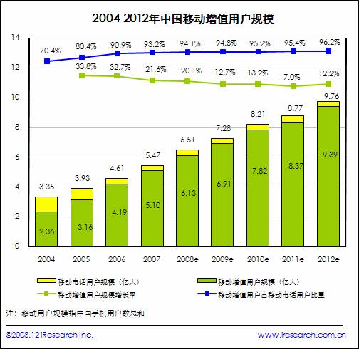 艾瑞咨詢根據(jù)工信部統(tǒng)計(jì)的中國移動(dòng)電話用戶數(shù)量并結(jié)合行業(yè)研究發(fā)現(xiàn),2008年中國移動(dòng)電話用戶數(shù)將達(dá)6.5億,同比增長19.0%,而2008年中國移動(dòng)增值用戶規(guī)模預(yù)計(jì)將達(dá)6.13億人,相比2007年的5.10億同比增長20.2%,占中國移動(dòng)電話用戶規(guī)模的94.1%。預(yù)計(jì)到2009年中國移動(dòng)增值用戶規(guī)模將達(dá)到6.91億人,而到2012年將突破9億人。