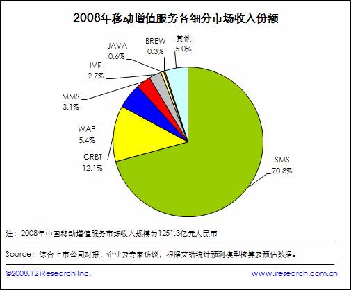 艾瑞研究發(fā)現(xiàn),2008年移動(dòng)增值服務(wù)細(xì)分市場收入中SMS以70.8%的比例占據(jù)主導(dǎo)地位,但其他業(yè)務(wù)對(duì)SMS的分流和替代使其增長率有所下降;CRBT、WAP分別以12.1%和5.4%的比例位居第二、第三。