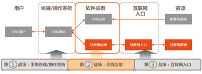 在楊俊看來,應(yīng)用商店的到來改變了傳統(tǒng)模式。例如,開放的互聯(lián)網(wǎng)模式推倒了原來的花園圍墻,手機(jī)軟件類型從單機(jī)應(yīng)用走向在線應(yīng)用,手機(jī)軟件來源從內(nèi)置型轉(zhuǎn)向用戶自主下載、自定制和自安裝。最重要的是,各大廠商不僅滿足于應(yīng)用商店這一畝三分地,而是把觸角延伸到了產(chǎn)業(yè)鏈上的各個(gè)環(huán)節(jié),由此形成了三個(gè)主要戰(zhàn)場:手機(jī)終端及操作系統(tǒng)、手機(jī)應(yīng)用、互聯(lián)網(wǎng)入口,具體見圖所示。
