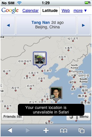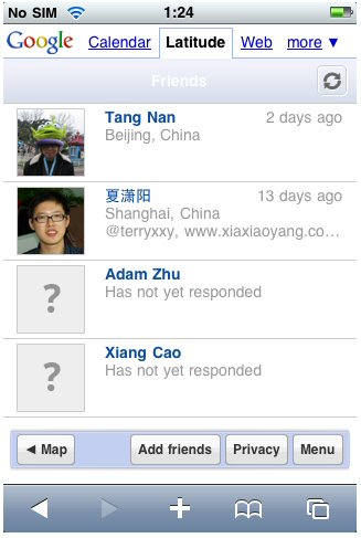 但是我沒找到在哪里設(shè)置自己的Latitude,就是說如果你不想共享自己的位置了怎么辦?想隱藏位置怎么辦?或者iPhone探測的不準,想手動調(diào)節(jié)位置,怎么辦?(當然大多數(shù)時間探測都是準的,這個功能是方便某些人讓別人誤認為自己在某個地方,然后偷偷摸摸的去做別的事情……)這些Phone在網(wǎng)頁里還做不到,但G1可以,畢竟G1是在Google Maps應(yīng)用里完成Latitude的。
